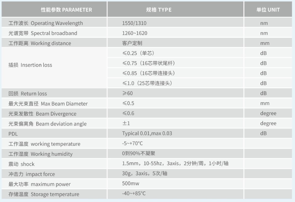 低插入損耗:單纖型(≤0.2dB),雙纖型(≤0.35dB) 高回波損耗:>55dB(最高可達70dB) 性能穩(wěn)定可靠,符合GR-1209-CORE和GR-1221-CORE標準產(chǎn)品結(jié)構(gòu)緊湊,尺寸可根據(jù)需求定制產(chǎn)品使用材料符合最新RoHS要求。
